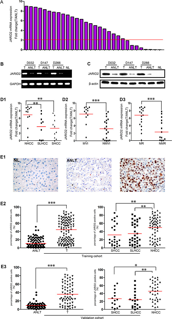 Figure 1: JARID2 is significantly upregulated in HCC tissues. (A) qRT-PCR results showed that compared with matched ANLTs, the expression level of JARID2 was significantly up-regulated in HCC tissues. The value of JARID2 mRNA in ANLTs was used to normalize (value set to 1) the value of JARID2 mRNA in HCC tissues. Red line indicates fold change of JARID2 equal to 2. T, HCC tissue; ANLT, adjacent nontumorous liver tissue. (B) The representative images of semiquantitative RT-PCR showed that JARID2 mRNA in HCC tissues was significantly higher than those in ANLTs. (C) Western blot results showed that JARID2 protein in HCC tissues was significantly higher than those in ANLTs. (D) JARID2 mRNA expression level was detected by qRT-PCR in NHCC, SLHCC and SHCC. The expression of JARID2 in NHCC was significantly higher than in SLHCC or SHCC, but there was no significant difference between SLHCC and SHCC (D1). JARID2 mRNA expression level was detected by qRT-PCR in HCC tissues with MVI and those without MVI (D2) and in HCC tissues with metastasis and/or recurrence and those without metastasis and/or recurrence (D3). SHCC, small hepatocellular carcinoma; SLHCC, solitary large hepatocellular carcinoma; NHCC, nodular hepatocellular carcinoma; MVI, with microvascular invasion; NMVI, without microvascular invasion; MR, with metastasis and/or recurrence; NMR, without metastasis and/or recurrence. (E) JARID2 expression in training cohort (n = 116) and in validation cohort (n = 66). The JARID2 expression was determined by immunohistochemistry (IHC) and calculated by percent of positive cells. Representative IHC images of normal liver (NL), ANLT, HCC tissues (T) (E1). The expression of JARID2 in ANLTs, HCC tissues (T) and in HCC subtypes (SHCC, SLHCC and NHCC) in training cohort (E2) and validation cohort (E3). *P < 0.05; **P < 0.01; ***P < 0.001.