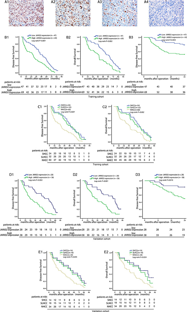 Figure 2: High JARID2 expression is significantly correlated with poor prognosis of HCC. (A) Representative IHC images for JARID2 expression. A1, more than 51% of cancer cells (scored as 3+); A2, 26%–50% of cancer cells (scored as 2+); A3, 11%–25% of cancer cells (scored as 1+); A4, negative control. Original magnification: ×400. (B) Kaplan-Meier analysis of the correlation between JARID2 expression and disease-free survival (B1), overall survival (B2), early recurrence (B3) of HCC patients in training cohort. (C) Survival analysis of three subtypes of HCC in training cohort. (D) Kaplan-Meier survival analysis of the correlation between JARID2 expression and disease-free survival (D1), overall survival (D2), early recurrence (D3) in validation cohort. (E) Survival analysis of three subtypes of HCC in validation cohort.
