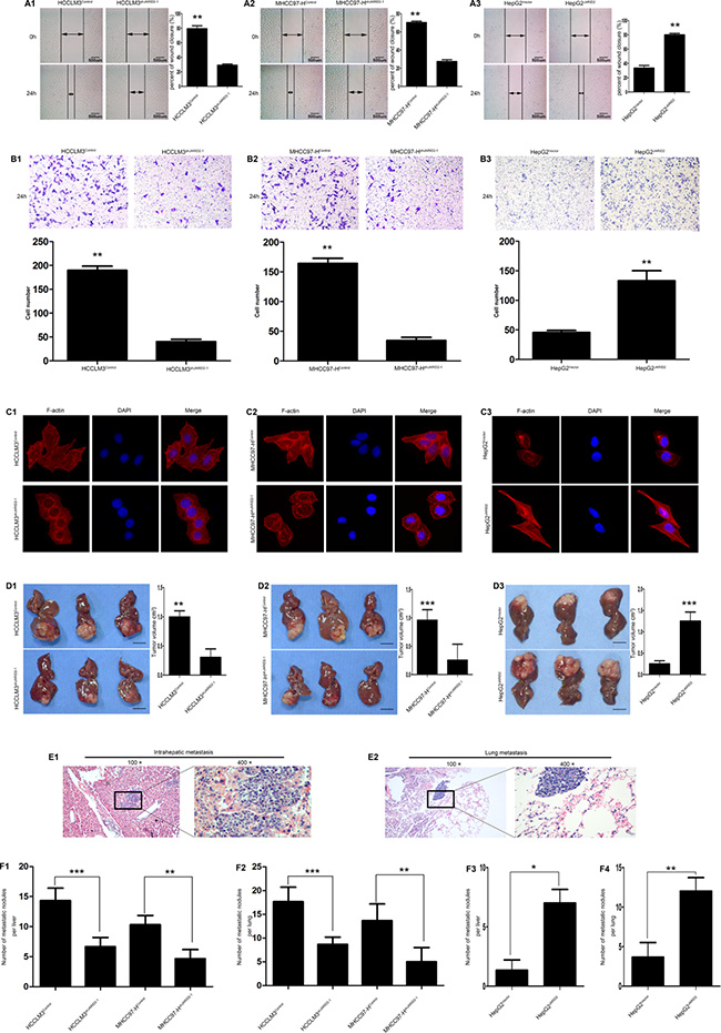 Figure 3: JARID2 significantly promotes invasion and metastasis of HCC cells in vitro and in vivo. (A) Knockdown of JARID2 expression inhibited HCCLM3 (A1) and MHCC97-H (A2) cells migration, whereas overexpressed JARID2 in HepG2 cells promoted cell migration (A3) in wound-healing assays. (B) The transwell assays showed that knockdown of JARID2 expression inhibited HCCLM3 (B1) and MHCC97-H (B2) cells invasion, but JARID2 overexpression enhanced HepG2 cells (B3) invasion. (C) Immunofluorescence assays of cytoskeleton of HCCLM3control and HCCLM3shJARID2-1 (C1), MHCC97-Hcontrol and MHCC97-HshJARID2-1 (C2), HepG2Vector and HepG2JARID2 cells (C3). F-actin filaments were visualized in cells using rhodamine-phalloidin. (D) The HCC metastatic mouse model was constructed by using HCCLM3 and MHCC97-H cells transfected with shJARID2-1 or control vector, and HepG2 cells transfected with JARID2 or control vector as described in the Materials and Methods. The size of liver tumors in each group was calculated and compared in HCCLM3 (D1), MHCC97-H (D2) and HepG2 (D3) cells. Scale bar, 1 cm. (E) Representative pictures for intrahepatic (E1) and lung metastasis (E2). (F) The number of metastatic nodules per liver or lung was calculated and compared between HCCLM3control and HCCLM3shJARID2-1 (F1), MHCC97-Hcontrol and MHCC97-HshJARID2-1 (F2), HepG2Vector and HepG2JARID2 cells group (F3, F4). *P < 0.05; **P < 0.01; ***P < 0.001.