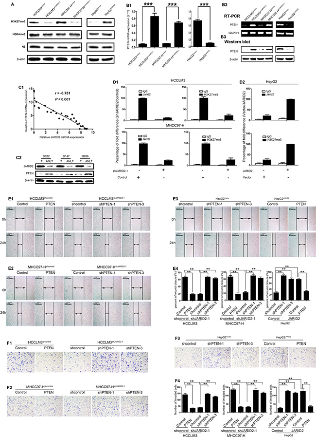 To determine whether PTEN is a mediator for JARID2-promoted invasion and metastasis in HCC, a complementary approach of gain- and loss-off function of PTEN was used. PTEN was overexpressed in HCCLM3shcontrol (Supplementary Figure 7D), MHCC97-Hshcontrol (Supplementary Figure 7E), HepG2JARID2 (Supplementary Figure 7F) with PTEN expression vector and knockdown in HCCLM3shJARID2 (Supplementary Figure 7D), MHCC97-HshJARID2 cells (Supplementary Figure 7E), HepG2Vector, (Supplementary Figure 7F). The overexpression of PTEN in HCCLM3shcontrol, MHCC97-Hshcontrol inhibited the migration and invasion (Figure 4E1, 4E2, 4E4 and 4F1, 4F2, 4F4). Moreover, downregulation of PTEN expression abolished the effect of JARID2 knockdown on migration and invasion in HCCLM3shJARID2 or MHCC97-HshJARID2 cells (Figure 4E1, 4E2, 4E4 and 4F1, 4F2, 4F4). In contrast, silence of PTEN expression mimicked the effect of JARID2 on migration and invasion capacity in HepG2Vector cells (Figure 4E3, 4E4 and 4F3, 4F4), while overexpression of PTEN attenuated JARID2-promoted migration and invasion in HepG2JARID2 cells (Figure 4E3, 4E4 and 4F3, 4F4). In addition, ectopic expression of PTEN reduced the proliferation and colony formation of HCCLM3shcontrol (Supplementary Figure 8A1, 8A2 and 8D), MHCC97-Hshcontrol cells (Supplementary Figure 8B1, 8B2 and 8E) and inhibition of PTEN expression restored the ability of the proliferation and colony formation of HCCLM3shJARID2 (Supplementary Figure 8A1, 8A2 and 8D), MHCC97-HshJARID2 cells (Supplementary Figure 8B1, 8B2 and 8E), while silence of PTEN expression mimicked the effect of JARID2 on colony formation ability or cell proliferation in HepG2Vector cells and overexpression of PTEN expression abolished the effect of JARID2 on colony formation ability and cell proliferation in HepG2JARID2 cell (Supplementary Figure 8C1, 8C2 and 8F). Collectively, these results indicate that JARID2 promotes HCC invasion and metastasis by suppressing PTEN expression via increasing H3K27me3 at its promoter region.