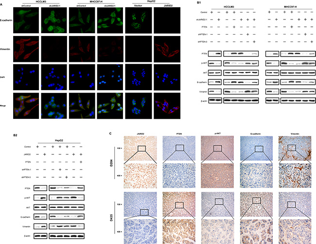 Paraffin-embedded tissues were sectioned and microwave-pretreated in EDTA buffer (1mM, pH 8.0) for 10 minutes for antigen retrieval. Then, formalin-fixed paraffin sections were stained for JARID2 (Santa Cruz Biotechnology) using the streptavidin-peroxidase system (Zhong-shan Goldenbridge Biotechnology, Beijing, China). To support the validity of the immunohistochemistry, HCCLM3shcontrol, HCCLM3shJARID2-1 cells were chosen used to perform cell immunohistochemistry to demonstrate the effectiveness of the antibodies JARID2 used, as PCR and Western blot showed HCCLM3 cells exhibited high JARID2 expression, and HCCLM3 transfected with the shJARID2-1 plasmid showed dramatically reduced JARID2 expression. Positive, negative control slides were probed with JARID2 antibody, goat serum respectively, and followed by the secondary antibody under the same conditions (Supplementary Figure 10A and 10B). The results proved that JARID2 antibody used was useful and specific for JARID2 (Supplementary Figure 10A 10B). The expression levels of JARID2 were scored using a four-point scale according to the percentage of positive hepatocytes: [40, 41] 0, ≤ 10% positive; 1+, 11%–25% positive; 2+, 26%–50% positive; 3+, ≥ 51% positive. The protein expression of JARID2 was thus considered negative if scored 0, and 1+, 2+, and 3+ as positive. According to the score of JARID2 expression, HCC specimens was also divided into a low expression group (0 or 1+) and a high expression group (2+ or 3+). For PTEN, p-AKT, vimentin, E-cadherin, the procedures as JARID2 and immunostaining score were adopt as described elsewhere [42]. Antibodies for PTEN, p-AKT, vimentin, E-cadherin were all purchased from Santa Cruz Biotechnology (Santa Cruz, CA).