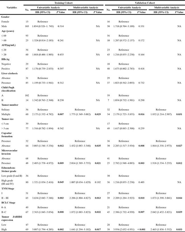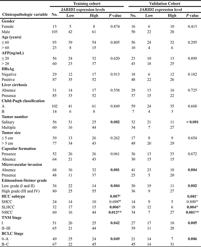Table 1: Correlations between JARID2 expression in HCC tissues and clinicopathologic variables of HCC patients in training and validation cohort