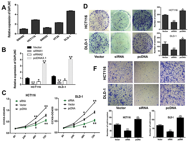 Figure 3: GAPLINC promoted CRC cell proliferation and invasion in vitro. A. Relative expression level of GAPLINC in CRC cell lines. B. GAPLINC mRNA levels of empty vector, GAPLINC-siRNA1, GAPLINC-siRNA2, and GAPLINC-pcDNA3.1 by qRT-PCR in HCT116 and DLD-1 cells. C, D. CCK-8 viability and colony-forming growth assays showed that HCT116 and DLD-1 cells transfected with siRNA1 inhibited the cell proliferation of CRC cells and increased the proliferation with GAPLINC-pcDNA3.1. E. Transwell assay showed that the knockdown of GAPLINC significantly suppressed cell invasion ability and upregulated GAPLINC-enhanced invasion. Data represent mean ± standard deviation from three independent experiments. *P < 0.05, **P < 0.01.
