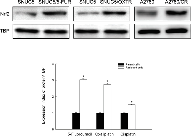 Figure 1: Nrf2 protein level in chemo-resistant cancer cells. The nuclear Nrf2 protein level in SNUC5 and SNUC5/5-FUR, SNUC5 and SNUC5/OXTR, A2780 and A2780/CR were assessed using Western blot analysis. TBP antibody was used as loading control for nuclear fraction. Densito-metric quantification of band intensity was measured and normalized relative to the band intensity of the TBP loading control. *Significantly different from parent cells respectively (p<0.05).