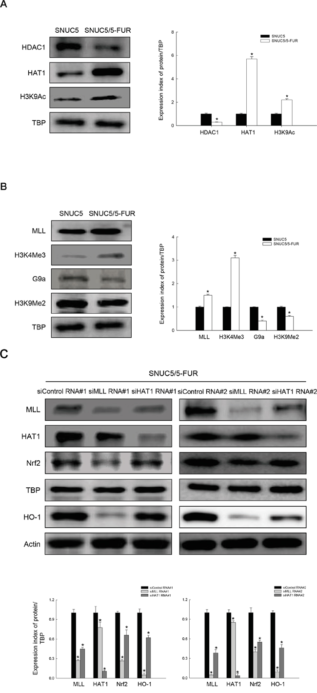 Figure 2: Expression of histone modification-related proteins in SNUC5 and SNUC5/5-FUR. A. Expression patterns of HDAC1, HAT1, and H3K9Ac in SNUC5 and SNUC5/5-FUR cells determined by Western blot analysis. *Significantly different from SNUC5 cells (p<0.05). B. Expression patterns of MLL, H3K4Me3, G9a, and H3K9Me2 in both cells determined by Western blot analysis. TBP antibody was used as loading control for nuclear fractions. *Significantly different from SNUC5 cells (p<0.05). The cells were transfected with non-targeting siRNA (siControl) or siMLL RNA or siHAT1 RNA for 24 h. C. Expression patterns of MLL, HAT1, Nrf2, and HO-1 in SNUC5/5-FUR determined by Western blot analysis. *Significantly different from untreated siControl-transfected cells (p<0.05).
