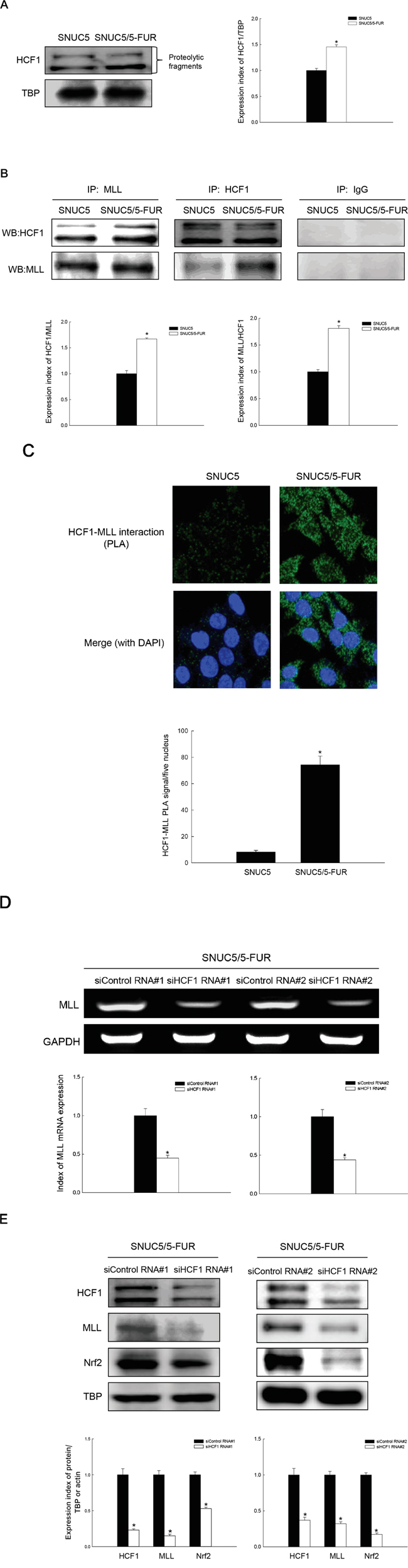 Figure 3: Effect of MLL-HCF1 interaction on histone methylation and Nrf2 expression in SNUC5/5-FUR cells. A. HCF1 expression was determined by Western blotting. *Significantly different from SNUC5 cells (p<0.05). B. Interaction between MLL and HCF1was examined by immunoprecipitation analysis using anti-MLL and anti-HCF1 antibodies followed by Western blotting with anti-HCF1 and anti-MLL antibodies. *Significantly different from SNUC5 cells (p<0.05). C. Interaction between MLL and HCF1was assessed by PLA. Each green spot represents for a single interaction (MLL and HCF1) and DNA was stained with DAPI. *Significantly different from SNUC5 cells (p<0.05). The cells were transfected with non-targeting siRNA (siControl) or siHCF1 RNA for 24 h. D. Expression pattern of MLL mRNA in SNUC5/5-FUR cells was determined by RT-PCR analysis. *Significantly different from siControl-transfected cells (p<0.05). E. Expression pattern of HCF1, MLL, and Nrf2 in SNUC5/5-FUR cells was determined by Western blot analysis. *Significantly different from siControl-transfected cells (p<0.05).