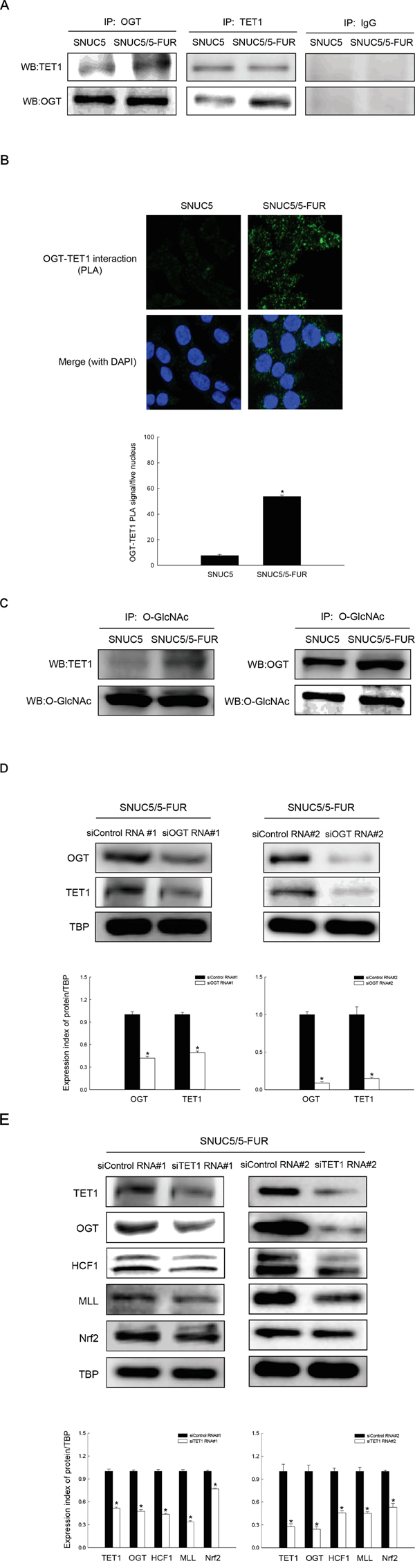 Figure 5: Relation of OGT-TET1 interaction on histone methylation and Nrf2 expression in SNUC5/5-FUR cells. A. Interaction between OGT and TET1 was examined by immunoprecipitation analyses using anti-OGT and anti-TET1 antibodies followed by Western blotting with anti-TET1 and anti-OGT antibodies. B. Interaction between OGT and TET1 was assessed by using PLA. Each green spot represents for a single interaction (OGT and TET1) and DNA was stained with DAPI. *Significantly different from SNUC5 cells (p<0.05).C. The O-GlcNAcylated TET1 or O-GlcNAcylated OGT was examined by immunoprecipitation analyses using anti-O-GlcNAc antibody followed by Western blotting with anti-TET1 and anti-OGT antibodies. The cells were transfected with non-targeting siRNA (siControl) or siOGT RNA or siTET1 RNA for 24 h. D. Expression pattern of OGT and TET1 in SNUC5/5-FUR cells was determined by Western blot analysis. *Significantly different from siControl-transfected cells (p<0.05). E. Expression pattern of TET1, OGT, HCF1, MLL, and Nrf2 in SNUC5/5-FUR cells was determined by Western blot analysis. *Significantly different from siControl-transfected cells (p<0.05).