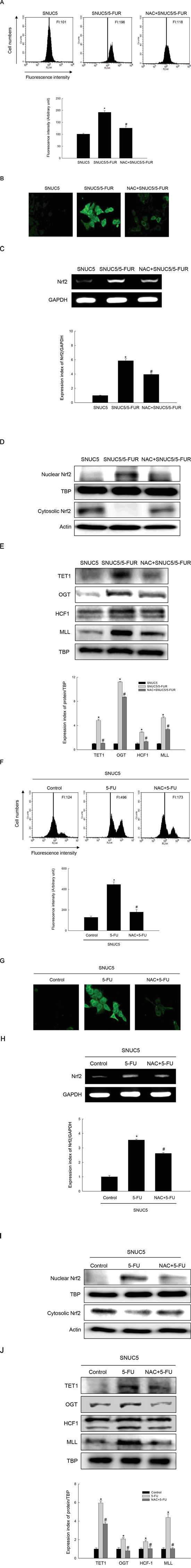 Figure 7: 5-FU-produced ROS involved in histone methyltransferase-mediated Nrf2 expression. SNUC5/5-FUR cells were pre-treated with 500 μM NAC, plated, and incubated for 48 h. Then, cells were treated with 10 μM DHR123 and incubated for 30 min at 37°C. The intracellular ROS were detected by A. flow cytometry and B. confocal imaging. FI indicates the fluorescence intensity of DHR-123. *Significantly different from SNUC5 cells (p<0.05), and #significantly different from SNUC5/5-FUR cells (p<0.05). C. Expression pattern of Nrf2 mRNA was determined by RT-PCR analysis. *Significantly different from SNUC5 cells (p<0.05), and #significantly different from SNUC5/5-FUR cells (p<0.05). D. Expression pattern of nuclear and cytosolic Nrf2 protein was determined by Western analysis. E. Expression patterns of TET1, OGT, HCF1, and MLL in NAC pre-treated SNUC5/5-FUR cells determined by Western blot analysis. *Significantly different from SNUC5 cells (p<0.05), and #significantly different from SNUC5/5-FUR cells (p<0.05). Also, SNUC5 cells were pre-treated with 500 μM of NAC and incubated for an additional 1 h at 37°. Cells were then treated with 140 μM 5-FU for 48 h. 10 μM of DHR123 was added to plate and incubated for an additional 30 min at 37°C. F. The intracellular ROS level was detected by flow cytometry and G. confocal imaging. FI indicates the fluorescence intensity of DHR123. *Significantly different from SNUC5 cells (p<0.05), and #significantly different from 5-FU-treated SNUC5 cells (p<0.05). H. Expression pattern of Nrf2 mRNA was determined by RT-PCR analysis. *Significantly different from SNUC5 cells (p<0.05), and #significantly different from 5-FU-treated SNUC5 cells (p<0.05). I. Expression pattern of nuclear and cytosolic Nrf2 protein was determined by Western analysis. J. The expression of TET1 and interaction proteins detected by Western blot analysis. *Significantly different from SNUC5 cells (p<0.05), and #significantly different from 5-FU-treated SNUC5 cells (p<0.05).