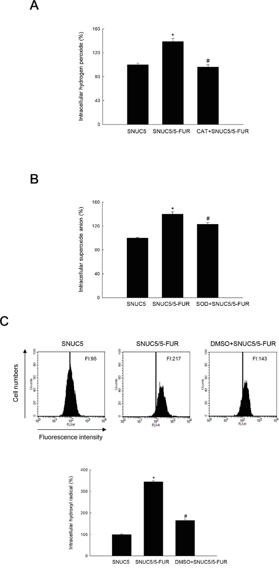 Figure 8: Detection of H2O2, O2-, and HO· in SNUC5 and SNUC5/5-FUR cells. SNUC5/5-FUR cells were pre-treated with specific ROS scavengers, CAT for H2O2 at 0.5 U/ml, SOD for O2- at 30 U/ml, and 2% DMSO for HO· radical, and incubated for 48 h. Then cells were treated with ROS probes (25 μM of DCF-DA for H2O2, 10 μM of DHE for O2- and 10 μM of HPF for HO·) and incubated for 30 min at 37°C. A. The H2O2 level and B. O2- level were detected by fluorescence spectroscopy. *Significantly different from SNUC5 cells (p<0.05), and #significantly different from SNUC5/5-FUR cells (p<0.05). C. HO· radical was detected by flow cytometry. FI indicates the fluorescence intensity. *Significantly different from SNUC5 cells (p<0.05), and #significantly different from SNUC5/5-FUR cells (p<0.05).