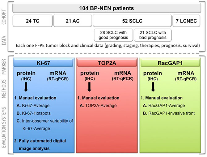 The first aim of our study was to compare the current Ki-67 detemination methods when used for BP-NEN diagnosis. Two manual Ki-67 immunohistochemistry (IHC) evaluation methods were compared with a fully automated digital image analysis of the same slides and a real time RT-PCR of adjacent paraffin sections. The IHC inter-observer variability for the manual counting method was also evaluated. The second aim was to define Ki-67 cut-off values for the BP-NEN entities for each evaluation method. The Ki-67 protein and mRNA expression levels were then compared with those of TOP2A and RacGAP1. The suitability of the three proliferation markers for differentiation of the BP-NEN entities was then evaluated, and correlations with the patients’ clinical data were calculated (overview over patient population see Figure 1).