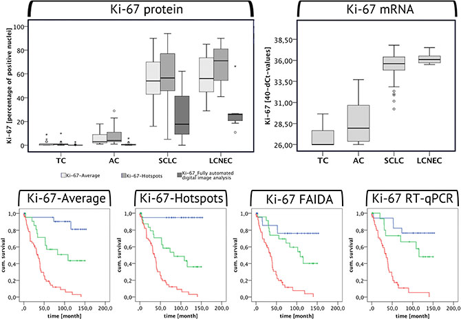 To detect the optimal Ki-67 cut-off points between TC and AC, AC and SCLC and AC and LCNEC, ROC analyses were performed. In our Ki-67-Average evaluation the optimal cut-off value to distinguish TC from AC is 1.5% (AUC = 0.870, p < 0.001, sensitivity = 0.810, 1-specificity = 0.167), AC from SCLC 19.0% (AUC = 0.998, p < 0.001, sensitivity = 0.960, 1-specificity = 0.000) and AC from LCENC 23.5% (AUC = 1.000, p < 0.001, sensitivity = 1.000, 1-specificity = 0.000). When evaluating the Ki-67-Hotspots the analysed cut-off value between TC and AC amounted to 1.5% (AUC = 0.930, p < 0.001, sensitivity = 0.952, 1-specificity = 0.167), between AC and SCLC to 22.0% (AUC = 0.974, p < 0.001, sensitivity = 0.900, 1-specificity = 0.095) and between AC and LCNEC to 35.00% (AUC = 1.000, p < 0.001, sensitivity = 1.000, 1-specificity = 0.000). In case of the Ki-67-FAIDA the cut-off values were much lower as compared to the manual Ki-67 evaluation methods: TC-AC: 0.14% (AUC = 0.730, p = 0.008, sensitivity = 0.762, 1-specificity = 0.208), AC-SCLC: 3.23% (AUC = 0.946, p < 0.001, sensitivity = 0.900, 1-specificity = 0.048), AC-LCNEC: 8.32% (AUC = 1.000, p < 0.001, sensitivity = 1.000, 1-specificity = 0.000). When analysing the RT-qPCR data, the following limits were obtained: TC-AC: 26.39 (AUC = 0.737, p = 0.021, sensitivity = 0.733, 1-specificity = 0.278), AC-SCLC: 32.19 (AUC = 0.977, p < 0.001, sensitivity = 0.907, 1-specificity = 0.067), AC-LCNEC: 34.61 (AUC = 1.000, p < 0.001, sensitivity = 1.000, 1-specificity = 0.000).