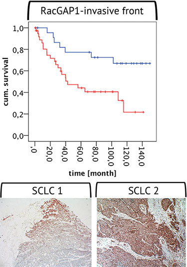 Strong positive correlations with the grading and the T and N stage of the BP-NEN patients investigated could be observed for all three proliferation markers both in IHC and in RT-qPCR (see Table 2). When comparing SCLC patients with good and poor prognosis, solely RacGAP1 protein levels were significantly elevated in patients with poor prognosis.