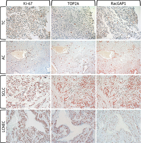 Figure 5: Immunohistochemical stainings of Ki-67, TOP2A and RacGAP1. Immunohistochemical staining of Ki-67, TOP2A and RacGAP1 at the same location of each one TC, AC, SCLC and LCNEC sample (magnification 40 × 10).