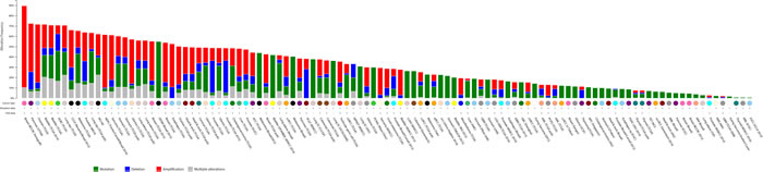 Figure 3: Frequency of LC3 family member gene expression changes in various cancer types. The cumulative gene expression changes for 4 LC3 family members are shown (MAP1LC3A, MAP1LC3B, MAP1LC3B2, MAP1LC3C). Shown in blue colour are copy number deletions, in red are copy number amplifications and in green are mutations.