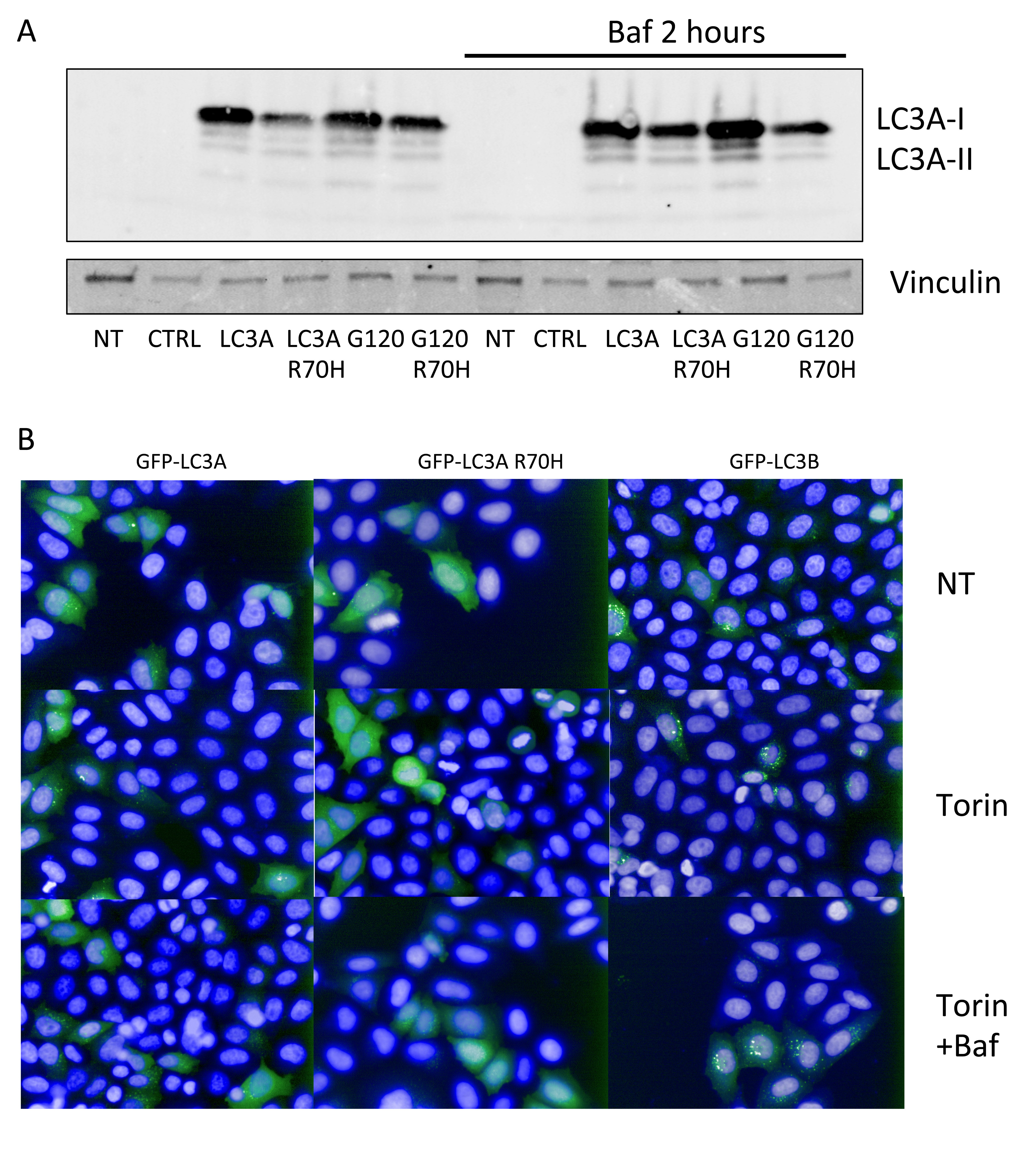 Figure 6: Reduced LC3A R70H processing in cells. A. Flag-tagged LC3A and LC3A R70H were transfected in HEK293T cells and left untreated or treated with Bafilomycin A. Cell lysates were resolved by SDS-PAGE and analysed by western-blotting using anti-Flag antibodies. The R70H mutant displays a reduction in LC3A-II that does not accumulate upon treatment with Bafilomycin A1. Vinculin was used as loading control. NT - not transfected; CTRL - transfected with empty control vector. B., 293T cells were transfected with GFP-tagged LC3B, LC3A and LC3A R70H and subsequently treated with Torin 1 (250nM) or Torin1 plus Bafilomycin A and compared to DMSO treated cells. Cells were counter-stained with Hoechst 33342 to identify nuclei.