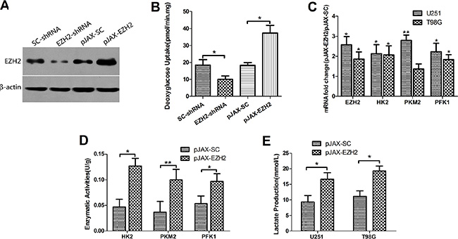 Figure 1: EZH2 is involved in the glycolytic metabolism in glioblastoma cells. (A) Levels of EZH2 protein were analyzed by immunoblotting U251 glioblastoma cells transfected with SC-shRNA, EZH2-shRNA, pJAX-SC or pJAX-EZH2. β-actin served as a loading control. (B) Relative deoxyglucose uptake was measured in U251 cells transfected with SC-shRNA, EZH2-shRNA, pJAX-SC or pJAX-EZH2. Each bar represents the mean ± s.d. from three independent experiments. *P < 0.05. (C) mRNA levels of HK2, PKM2 and PFK1 were determined in the indicated cells. Each bar represents the mean ± s.d. from three independent experiments. *P < 0.05, **P < 0.01. (D) Enzymatic activities of HK2, PKM2 and PFK1 were determined in the indicated U251 cells. Each bar represents the mean ± s.d. from three independent experiments. *P < 0.05, **P < 0.01. (E) Lactate production was measured in U251 and T98G cells transduced with pJAX-SC or pJAX-EZH2. Data were presented as the mean ± s.d. from three independent experiments. *P < 0.05.
