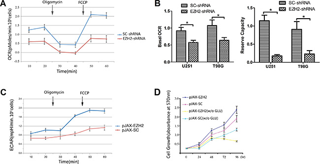 Figure 2: Upregulation of EZH2 induces an inclination toward glycolytic respiration. (A) OCRs were determined using a Seahorse XF24 analyzer with U251 glioblastoma cells transfected with SC-shRNA or EZH2-shRNA. Oligomycin (1 mM) and FCCP (300 mM) were administered as indicated. (B) Basal OCR was calculated as the mean of original OCRs minus the mean of OCRs after addition of oligomycin. Reserve capacity was calculated as maximal OCR (FCCP-induced levels) minus basal OCR. Results are presented as the mean ± s.d. from three independent experiments. *P < 0.05. (C) ECARs were determined using a Seahorse XF24 analyzer with U251 glioblastoma cells transfected with pJAX-SC or pJAX-EZH2. Oligomycin (1 mM) and FCCP (300 mM) were administered as indicated. (D) Growth curves for the indicated U251 cells cultured in glucose-containing (4500 mg/l) or glucose-free (w/o GLU) medium. Each bar represents the mean ± s.d. from three independent experiments.