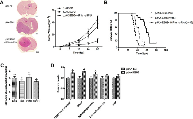 Figure 3: EZH2 is associated with to HIF1α-related metabolic reprogramming in intracranial glioma xenografts. (A) Representative micrographs of H&E staining sections of mouse brain 32 days after intracranial implantation of U251 cells transfected with pJAX-SC, pJAX-EZH2 or pJAX-EZH2+HIF1α-shRNA. Asterisks indicate tumors (scale bar, 1 mm). The line chart shows the estimated tumor volumes at the indicated times (Nsc = 20, NEZH2 = 21, NEZH2+ HIF1α-shRNA= 20 ). (B) Curves showing the survival rates of the engrafted mice (Nsc = 16, NEZH2 = 15, NEZH2+ HIF1α-shRNA=12 ). (C) Levels of EZH2, HK2, PKM2 and PFK1 mRNA in the xenograft tumors. Data are presented as the mean ± s.d. from three independent experiments. *P < 0.05, **P < 0.01. (D) Levels of glycolytic intermediates. Data are presented as the mean ± s.d. from three independent experiments. *P < 0.05.