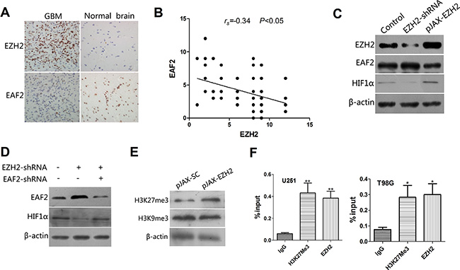 Figure 5: EAF2 is an EZH2 target gene involved in the regulation of HIF1α. (A) IHC analysis of EZH2 and EAF2 expression in glioblastoma specimens and samples of normal brain tissue (400×). (B) Correlation between expression of EZH2 and EAF2 in 105 blioblastoma specimens (P < 0.05). (C) Levels of EAF2 and HIF1α protein were measured by immunoblotting U251 cells transfected with control vector, EZH2-shRNA or pJAX-EZH2. β-actin was used as a loading control. (D) EAF2 expression was silenced or not in U251 cells transfected with SC-shRNA or EZH2-shRNA. Immunoblots showing EAF2 and HIF1α levels in the indicated cells. β-actin was used as a loading control. (E) Immunoblots showing H3K27me3 and H3K9me3 levels in control and EZH2-overexpressing U251 cells. β-actin was used as a loading control. (F) U251 and T98G cells were subjected to ChIP analysis using antibodies against H3K27me3 or EZH2 with primers targeted to the promoter region of EAF2. Isotype matched IgG was used as a negative control. Data are presented as the mean ± s.d. from three independent experiments. *P < 0.05, **P < 0.01.