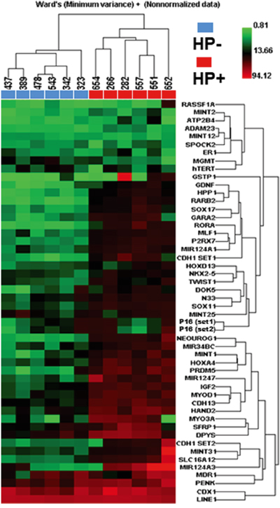 Figure 1: Unsupervised hierarchical clustering analysis of 49 PCGIs and LINE1 repetitive element among six H. pylori negative (blue boxes) and six positive cases (red boxes). Numbers listed above the blue and red boxes indicates sample ID.