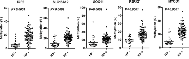 Figure 2: Methylation status of five PCGIs (IGF2, SLC16A12, SOX11, P2RX7 and MYOD1) among all subjects with or without H. pylori infection. Horizontal bars represents mean methylation percentage. The statistical analysis was performed using Student's t-Test.