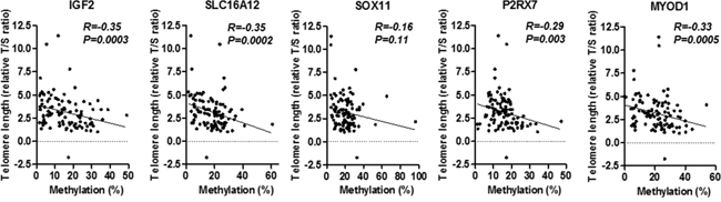 Figure 4: Association between telomere shortening and methylation status of five PCGIs (IGF2, SLC16A12, SOX11, P2RX7 and MYOD1) Statistical analysis was performed using the Spearman correlation analysis.