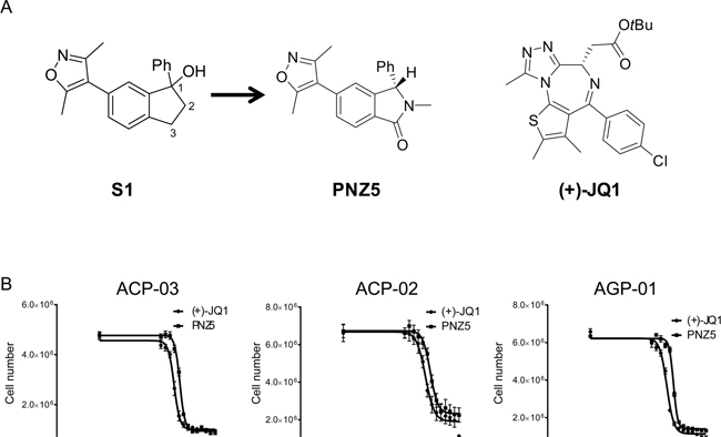 Initial screening with a small library of 19 epigenetic probes was performed in three GC cell lines, but only 5 compounds (Bromosporine, UN1999, UNC0638, (+)-JQ1 and PNZ5) inhibited the growth of the cells at a concentration of 10 μM after 72h incubation (Supplementary Table 1). (+)-JQ1 and PNZ5 were the most active compounds, with strong antiproliferative activity and were therefore chosen for further investigation (Figure 1B).