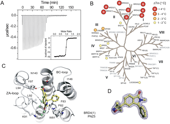 Figure 2: Characterization of PNZ5. A. Isothermal titration data of the interaction of PNZ5 with the first bromodomain of BRD4 (BRD4(1)). Shown are the raw binding heats for each injection as well as normalized binding enthalpies. B. Selectivity of PNZ5 calculated using thermal shift (ΔTm) assays. Screened targets (labelled in black) in the phylogenetic tree based on the BRD family structure based alignment [71]. C. Binding mode of PNZ5 bound to BRD4(1). Hydrogen bonds to the conserved asparagine (N140) and tyrosine (Y97) are shown as dotted green lines. D. Electron density map (2FoFc) contoured at 2σ around the inhibitor.