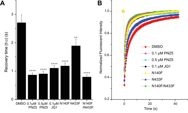 Figure 3: Effect of (+)-JQ1 and PNZ5 on intracellular motility of BRD4. A. Fluorescence recovery half-times for full-length BRD4. PNZ5 significantly decreased half recovery times of U2OS cells transfected with wild-type full-length GFP-BRD4, as did (+)-JQ1. Half recovery times were accelerated to the level of the double bromodomain mutant N140F/N1433F and faster than the single mutant. B. Time dependence of the fluorescence recovery of the bleached area. At least 20 nuclei were bleached for each experiment and the mean recovery time as well as the standard error of mean (SEM) are shown in A (****p<0.0001; ** p<0.002).