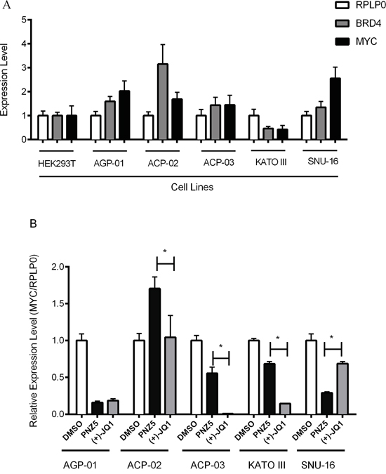 Figure 4: Expression profile of BRD4 and c-MYC mRNA levels by qRT–PCR in a panel of gastric cancer cell lines. A. Expression of BRD4 was evaluated in a panel of human gastric cancer cell lines and compared with HEK293T cells. B. Expression of c-MYC was evaluated in all gastric cell lines after 6 h treatment with (+)-JQ1 and PNZ5 (500 nM). The mRNA level for BRD4 and c-MYC was normalized to RPLP0 mRNA level in each cell line. Average and standard deviation were calculated from two independent experiments in triplicate.