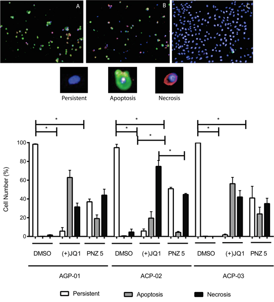 In order to determine if the two compounds lead to the same cell death pattern, we performed a triple staining protocol using a high content imaging system (Figure 5). Cells treated with (+)-JQ1 and PNZ5 induced apoptosis in the three cell lines; AGP-01, ACP-02 and ACP-03 (Figure 5). After 72h, (+)-JQ1 (400 nM) induced apoptosis and necrosis in 62% and 31% of AGP-01cells, whereas PNZ5 (400 nM) induced 19% and 44% respectively. As for ACP-02, (+)-JQ1 induced 19% and 74% and PNZ5 induced 4% and 45% of apoptosis and necrosis, respectively. In ACP-03, (+)-JQ1 induced 56% and 42% and PNZ5 induced 24% and 35% of apoptosis and necrosis, respectively. There was no significant difference between the two compounds in inducing either apoptosis or necrosis apart from induction of necrosis in the ACP-02 cell line, consistent with their identical mode of action. As expected, there was a significant reduction in persistent cells in all cell lines when compared to the DMSO control.