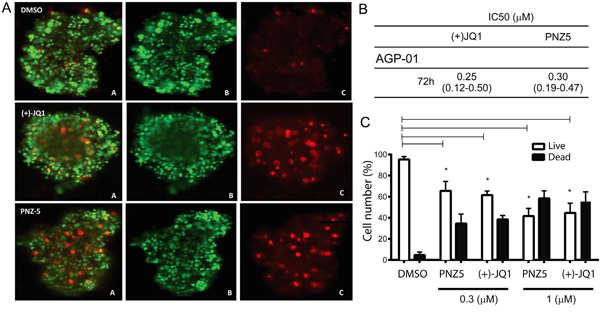 Figure 6: In vitro cytotoxic activity of (+)JQ-1 and PNZ5 on AGP-01 spheroids. A. Live/Dead cell staining for AGP-01 spheroids treated with (+)JQ-1 (300nM) and PNZ-5 (300 nM). A. Merge; B. Calcein; C. EthD-1; B. IC50 values (μM) and confidence interval of 95% obtained by the Resazurin assay in AGP-01 spheroids 72 h of exposure; C. Live/Dead cell quantification. Experiments were performed in triplicates and means from three independent experiments are reported. *p<0.01