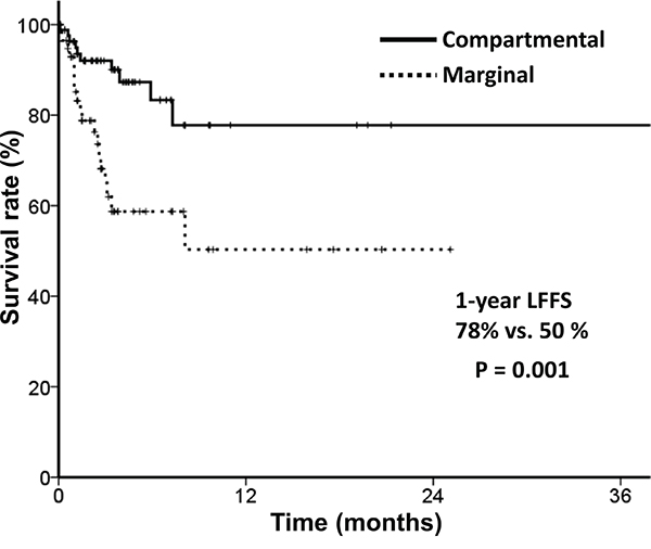 Acute RT-related toxicities are summarized in Table 5. Grade IV neutropenia and thrombocytopenia (n=4 and n=3, respectively) were observed with compartmental target volume treatment. No grade IV toxicities were observed with marginal target volume treatment. However, these were not statistically significant (p=0.087 for neutropenia and p=0.162 for thrombocytopenia, respectively).