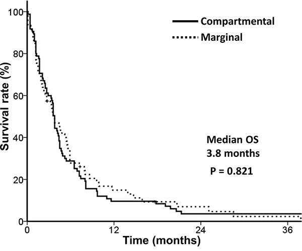 Median OS was 3.8 months, and no difference in OS was detected between different CTVs (Figure 2).
