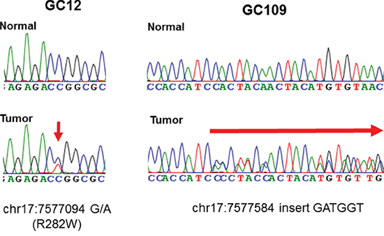 We performed Sanger sequencing of TP53 genes in 214 GC tissues and matched normal tissues Representative sequencing chromatograms are shown in Figure 1.
