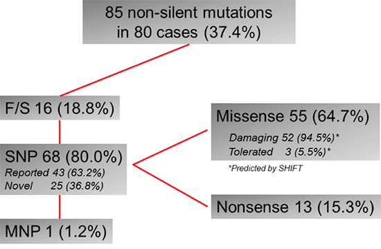 Figure 2: Summary of TP53 mutations in 214 GC cases. F/S, frame shift; SNP, single nucleotide polymorphism; MNP multiple nucleotide polymorphism;