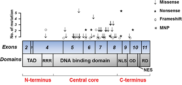 Figure 3: Mutation spectrum of TP53 in 214 GC cases. Individual exons are represented as numbered boxes. TAD, Trans activation domain; RRR, Proline-rich region; NLS, nuclear localization signal sequence; OD, Tetramerization domain; NES, nuclear export signal sequence; RD, Regulatory domain;