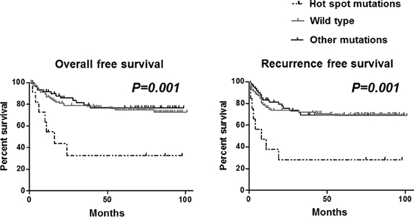 The statistical significance of the differential frequency of TP53 mutations in two groups was determined using two-tailed Fisher’s exact test. Overall survival and recurrence free survival, in relation to the TP53 mutations was assessed using the Kaplan-Meier method and the Log rank test. P value <0.05 was considered statistically significant.