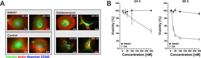Figure 1: NW457 reveals no detectable hepatocytotoxicity in vitro. Primary hepatocytes of C57BL/6 mice were exposed to 0-300 nM of NW457, geldanamycin (GA), or DMSO as vehicle control. Cellular morphology and viability were assessed by immunofluorescence microscopy and Alamar Blue assays. A. Immunofluorescence microscopy was performed after 24 h. Cells were fixed, permeabilized, and stained with anti-tubulin-FITC, phalloidin-Alexa Fluor 568 for actin visualization, and Hoechst 33342 for DNA visualization. Scale bars represent 20 µm. B. Alamar Blue viability tests were performed after 24 and 48 h, and the results were calibrated on the vehicle controls (100% viability). Means ± s.d. of intra-assay quadruplicates of one representative of three experiments are depicted.