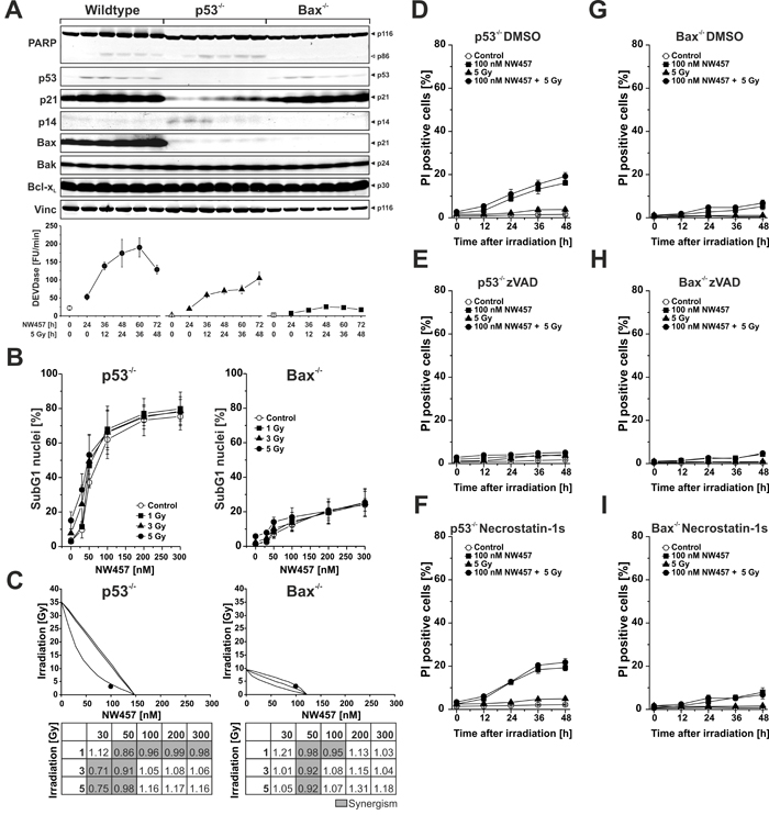 Figure 4: Apoptosis induction and transition into secondary necrosis upon NW457 treatment in combination with irradiation relies only in part on functional p53. HCT116 wildtype cells and p53-deficient or Bax-deficient subclones were treated with 0-300 nM NW457, irradiated at 0-5 Gy, and subjected to Westernblot analyses, DEVDase activity measurements, and FACS analyses of subG1 nuclei. A. Upper panel: Westernblot analysis of crucial signaling proteins involved in apoptosis induction after stimulation with 100 nM NW457 and 5 Gy 0-48 h after irradiation (150 µg protein per lane). Vinculin was used as loading control (10 µg protein per lane). Each blot is representative of three independent experiments. Lower panel: Analysis of DEVDase activity. Means ± s.d. of three experiments are shown. B. FACS analysis of subG1 nuclei in p53-/- and Bax-/- cells 48 h after irradiation +/- NW457 treatment. Means ± s.d. of three independent experiments are shown. See Figure 2B for comparison with HCT116 wildtype cells. C. Isobologram analyses (combination 100 nM NW457 + 3 Gy) and CI matrices of the data shown in (B). For p53-/- cells, the data point of the combined treatment lies below the surface of additivity showing a synergistic mode of action. For Bax-/- cells, the data point lies within the surface of additivity reflecting additive, but not synergistic behavior. CI values highlighted in grey demonstrate a synergistic mode of action between NW457 treatment and ionizing radiation (CI < 1). See Figure 2C for comparison with HCT116 wildtype cells. D.-I. Kinetics of plasma membrane disintegration measured by PI exclusion FACS staining 0-48 h after irradiation at 5 Gy +/- treatment with 100 nM NW457 in the presence or absence of the poly-caspase inhibitor zVAD-fmk or the RIP kinase-1 inhibitor necrostatin-1s. See Figure 2E-G for comparison with HCT116 wildtype cells.