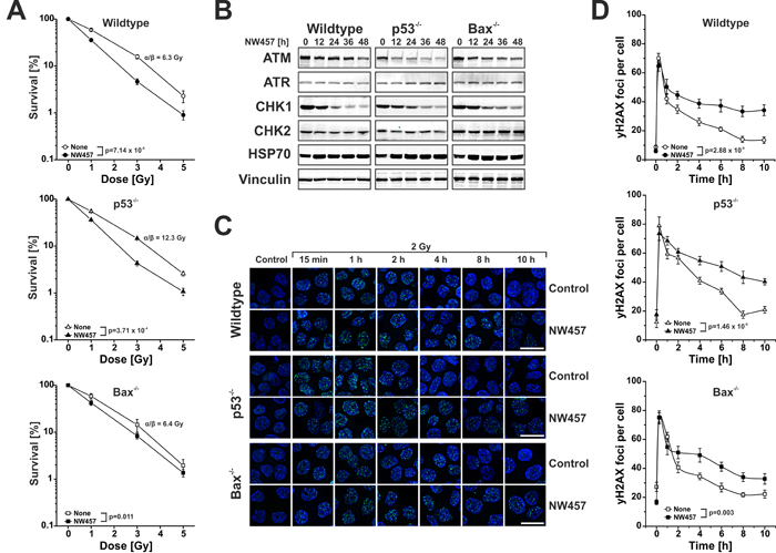Figure 5: NW457 enhances irradiation-induced clonogenic cell death accompanied by degradation of selective DNA damage repair mediators and decelerated DNA damage repair. HCT116 wildtype cells and p53-deficient or Bax-deficient subclones were treated with 0-30 nM NW457 and subjected to clonogenic survival assays, Westernblotting against selected DNA damage regulators, and immunofluorescence microscopy for visualization of γH2AX DNA damage repair foci. A. Clonogenic survival. HCT116 wildtype cells, p53-/-, and Bax-/- subclones were subjected to colony formation assays upon irradiation at 0-5 Gy +/- pretreatment with 10 nM NW457 for 24 h. After irradiation, cells were incubated for 14 days, the numbers of colonies with more than 50 cells were counted, and the surviving fractions were calculated by normalization on the not irradiated controls (100%). Means ± s.d. of three independent experiments are depicted. α/β-values were calculated by linear-quadratic fitting, and overall comparison of the curves was performed by two-way ANOVA. B. Westernblot analyses of selected DNA damage response regulators. Cells were treated with 20 nM NW457 for 0-48 h, and whole cell protein extracts were subjected to 4-8% or 6-15% SDS-PAGE with subsequent immunoblotting against ATM, ATR, CHK1, and CHK2 (300 µg protein per lane). Vinculin served as a loading control (30 µg protein per lane), and HSP70 (30 µg protein per lane) is depicted to show induction of the heat shock response. C. Immunofluorescence microscopy of γH2AX DNA damage repair foci. Cells were pretreated +/- 30 nM NW457 for 24 h and irradiated at 2 Gy. Immunofluorescence staining for γH2AX DNA damage repair foci (green) was performed at the indicated times. Nuclei were visualized by Hoechst 33342 staining. Scale bars depict 20 µm. D. Quantification of γH2AX DNA damage repair foci staining as shown in (C). 20 nuclei per condition were analyzed, and the numbers of γH2AX foci per cell are depicted as means ± s.e.m. Overall comparison of curves was performed by two-way ANOVA.