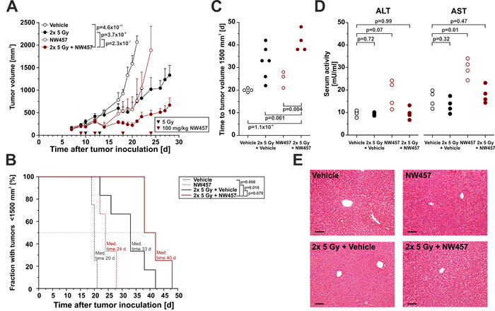 Figure 6: NW457 improves irradiation-mediated tumor control in vivo and reveals little hepatotoxicity. NW457-mediated radiosensitization was assessed in vivo by using a syngeneic heterotopic Balb/c mouse model of CT26 colorectal tumor cells growing on the right flank. 1.2x 106 CT26 cells were injected subcutaneously, and tumors were allowed to grow for 9 days. Mice with tumors of less than 300 mm3 were distributed into four groups and subjected to the following treatments: Vehicle only (n = 4), NW457 only (n = 6), 2x 5 Gy + vehicle (n = 6), and 2x 5 Gy + NW457 (n = 5). NW457 (100 mg/kg) and DMSO were administered by i.p. injection on days 9, 12, 18, and 24 (red arrowheads). Local irradiation was performed on days 10 and 13 (black arrowheads). Tumor growth and liver toxicity were monitored. A. Tumor growth. Tumor dimensions were measured every 1-3 days and tumor volumes were calculated using the formula (width x width x length)/2. Means + s.e.m. are shown. Overall comparison of curves was performed by two-way ANOVA. B. Kaplan-Meier survival curves. Tumor-specific death was scored when the tumor volume exceeded 1,700 mm3 and animals had to be sacrificed. Median survival times were determined, and p-values were calculated by log-rank test. C. Time to tumor volume 1,500 mm3. The time after which tumor size reached 1,500mm3 was determined, and compared by unpaired Student’s t-test. D. Serum levels of liver enzymes. Selected animals were sacrificed 2 days after the second irradiation fraction, and serum was collected for ALT and AST analyses. p-values were calculated by unpaired Student’s t-test. E. Liver histology. Livers of animals sacrificed 2 days after the second irradiation fraction were explanted, formalin-fixed, paraffin-embedded, and 4 µm sections were stained with hematoxylin-eosin. Representative images of 1 out of 3-4 animals per group are shown. Scale bars represent 100 µm.