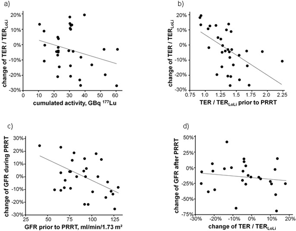 The relative loss of eGFR during follow-up after PRRT correlated better with the pre-therapeutic eGFR (Spearman ρ = 0.61; p = 0.001) than with the pre-therapeutic TER/TERLoLi ratio (Spearman ρ = 0.38; p = 0.05). No correlation was observed with the change of TER/TERLoLi (Spearman ρ = -0.16; p = 0.42, Figure 1d) and the change of eGFR (Spearman ρ = -0.28; p = 0.16) during PRRT.