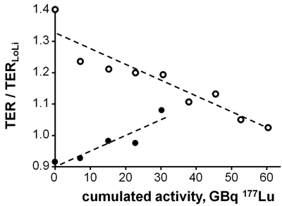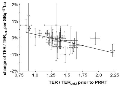 The time course of TER/TERLoLi was analyzed for each patient by comparing the MAG3 clearance data measured at baseline and after the last PRRT cycle and relating the change of TER/TERLoLi to the activities administered between both assessments of renal function. As explained above, data from the last PRRT cycle without later TER measurement were omitted from analysis.