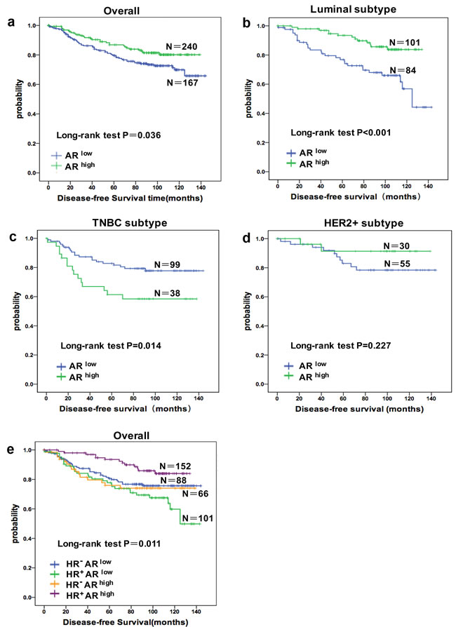 Androgen-based therapy in breast cancer was first described in the 1940s [18], its mechanisms remain unclear. We sought to dissect the androgen signaling pathways by exploring the associations between AR and cancer; Previous studies reported that AR could have either beneficial or deleterious effects depending on the breast cancer subtype [17, 18]. We find that AR has prognostic significance alone or in combination with HR status, and our data suggest that AR is associated with improved prognosis in luminal breast cancer and worse prognosis in TNBC.