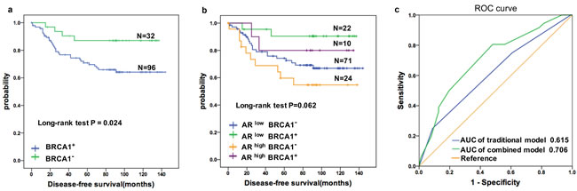 Figure 2: Prognostic value of the AR in TNBC patients was improved by combining BRCA1 status. a. Cumulative Disease-free Survival(DFS) curves of TNBC patients by BRCA1 status. b. Kaplan-Meier estimates of DFS according to AR and BRCA1 statuses in TNBC patients (log rank P = 0.062) c. ROC curves assessing the distinct performances of the combined and the traditional models for predicting the DFS in the TNBC cohort. Variables for the traditional model include TNM stage only. AR and BRCA1 were added in the combined model. p < 0.001 for AUC comparison.