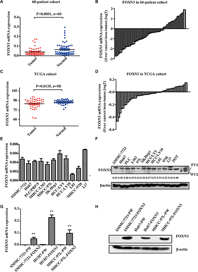 Figure 1: FOXN3 is often downregulated in HCC. (A) qRT-PCR was performed to detect the expression levels of FOXN3 in the 60-patient cohort. (B) The fold change in FOXN3 levels in paired tumorous/non-tumorous tissues in the 60-patient cohort. (C) Expression levels of FOXN3 in the TCGA cohort. (D) The fold change in FOXN3 levels in paired tumorous/non-tumorous tissues in the TCGA cohort. (E) qPCR analysis of FOXN3 expression in HCC cell lines. (F) Western blot analysis of FOXN3 expression in HCC cell lines. The protein expression was measured semi-quantitatively with ImageJ software (http://rsb.info.nih.gov/ij/index.html). Relative protein levels were determined by densitometry and calculated as the ratio of the interest protein to its loading control. (G) qPCR analysis of FOXN3 expression in HCC cells stably transfected with FOXN3 or control plasmids. (H) Western blot analysis of the FOXN3 protein in HCC cells stably transfected with FOXN3 or control plasmids. *P < 0.05, **P < 0.01.
