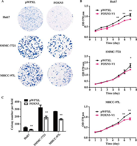 Figure 2: Overexpression of FOXN3 in HCC cells inhibits proliferation in vitro. (A) The colony formation assay was performed in HCC cells stably transfected with FOXN3 or control plasmids. (B) Cell growth was analyzed at different time points (every one day interval) using an MTT assay. (C) Statistical analysis of the results shown in (A). *P < 0.05, **P < 0.01.
