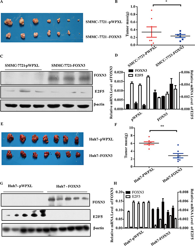 Figure 3: FOXN3 suppresses HCC tumorigenesis in vivo. (A) SMMC-7721 cells stably transfected with FOXN3 were subcutaneously injected into nude mice; empty vectors were used as a control. After 7 weeks, the tumors were removed from the nude mice. (B) The weight of the liver tumors in (A). (C) Western blot analysis of FOXN3 expression in the samples in (A). (D) qPCR analysis of FOXN3 expression in the samples in (A). (E) MHCC-97L cells stably transfected with FOXN3 were orthotopically injected into the livers of nude mice; empty vectors were used as a control. After 4 weeks, the tumors were removed from the nude mice. (F) The weight of the liver tumors in (E). (G) Western blot analysis of FOXN3 expression in the samples in (E). (H) qPCR analysis of FOXN3 expression in the samples in (E). *P < 0.05, **P < 0.01.