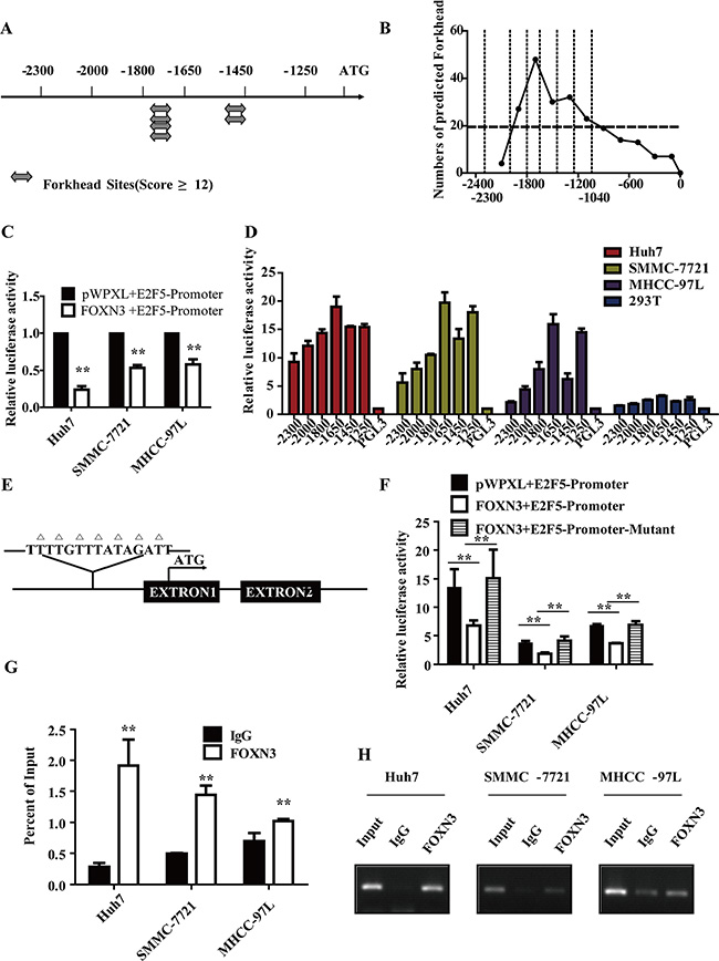 Figure 5: FOXN3 directly binds to and represses the E2F5 promoter in HCC cells. (A) Identification of potential forkhead binding sites in the E2F5 promoter with a score greater than 12 according to the JASPAR database. The analysis was performed by selecting all FOX family transcription factors from the JASPAR database as the template. (B) The numbers of all potential forkhead binding sites in the different regions of the E2F5 promoter. (C) Activity of the E2F5 promoter after transfection of FOXN3 into HCC cells. (D) Activity of the E2F5 promoter deletion mutants in Huh7, SMMC-7721, MHCC-97L and 293T cells. (E) The predicted FOXN3 binding site on the E2F5 promoter; the mutant is marked. (F) The activities of the E2F5 promoter and the mutant promoter after transfection of HCC cells with FOXN3. (G) The binding of FOXN3 to the E2F5 promoter in HCC cells was analyzed by chromatin immunoprecipitation using antibodies to FOXN3. A negative control with an irrelevant antibody (IgG) was included for comparison. qPCR was used to analyze the E2F5 promoter. (H) Agarose gel electrophoresis was used to analyze the crosslinking status. *P < 0.05, **P < 0.01.